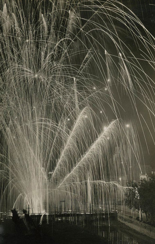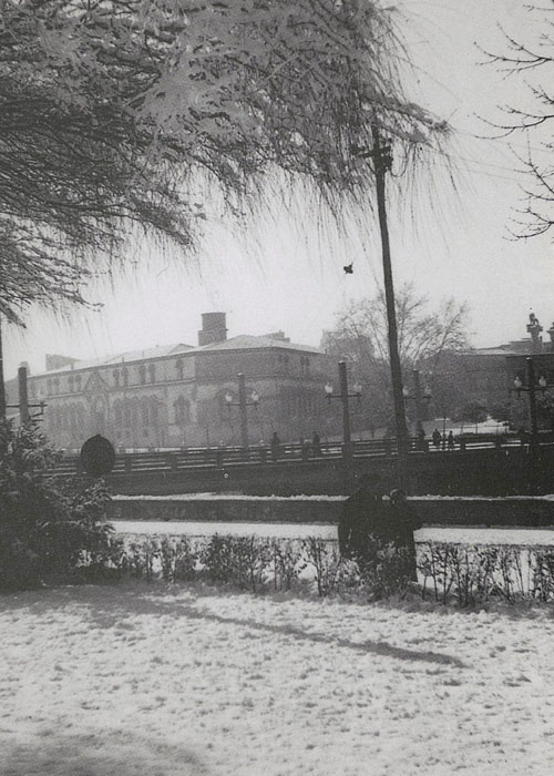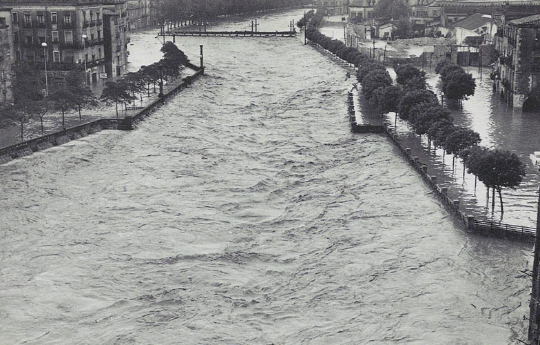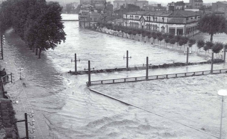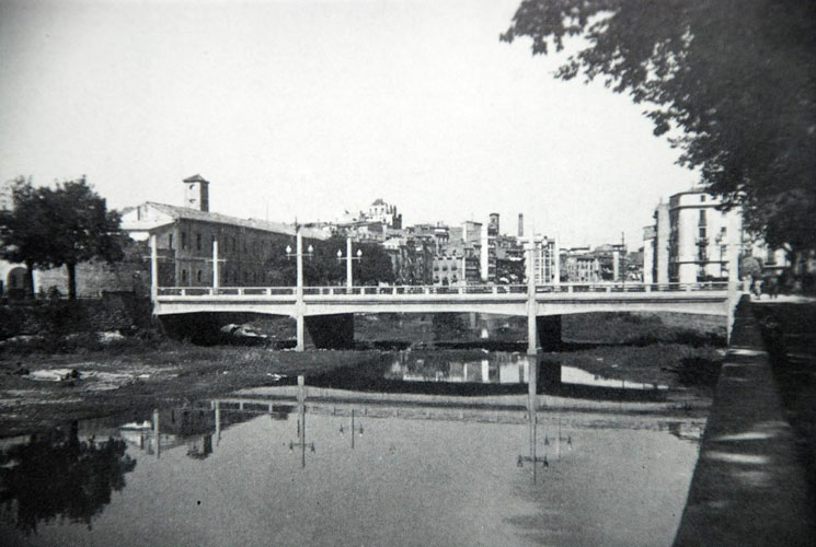 En els aiguats de 1940, Hermógenes Huarte era alferes provisional del Batalló de Treballadors núm. 69. Segons Josep Clara, a "Esclaus i peons de la Nueva España; els batallons de treballadors a Catalunya (1939-1942)", (Cercle d’estudis Històrics i Socials de Girona, 2007), aquests batallons disciplinaris de treballadors estaven farcits de presoners que purgaven la seva fidelitat a la República en el cop d'estat del General Franco. Cal no oblidar que l'aiguat de 1940 arribà tot just vuit mesos després d'acabada la Guerra Civil. ![]() (Ampliar) - El llit del riu Onyar a l'altura del pont del Pes de la Palla, amb el pont de l'alferes Huarte al fons. 1941-1950. Col·lecció Ajuntament de Girona.