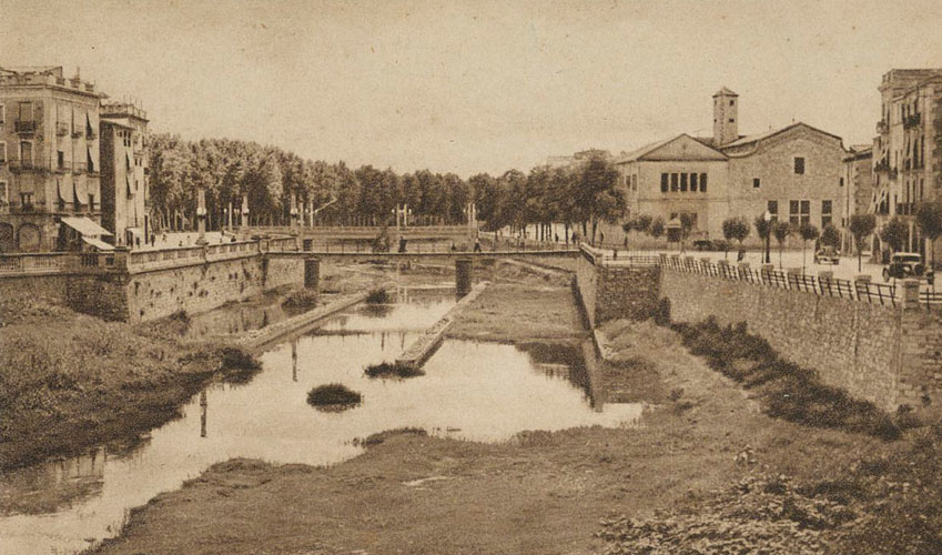 La construcció del pont. ![]() (Ampliar) - El pont de l'alferes Huarte, que comunica la plaça Calvet i Rubalcaba amb el carrer del Carme. Autor desconegut. Col·lecció Ajuntament de Girona .