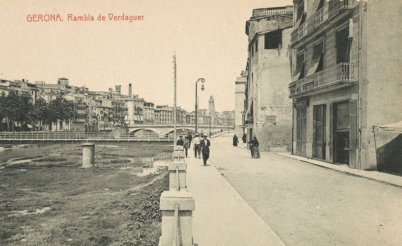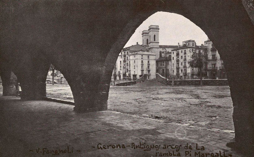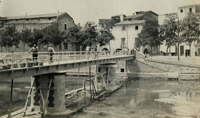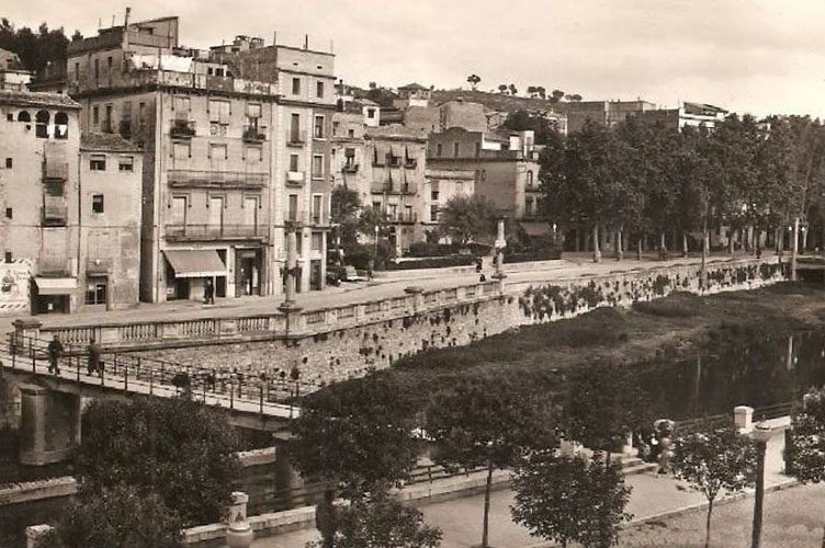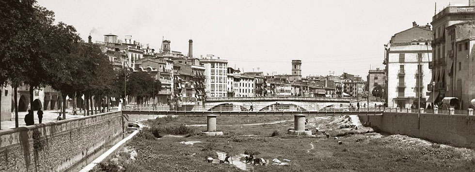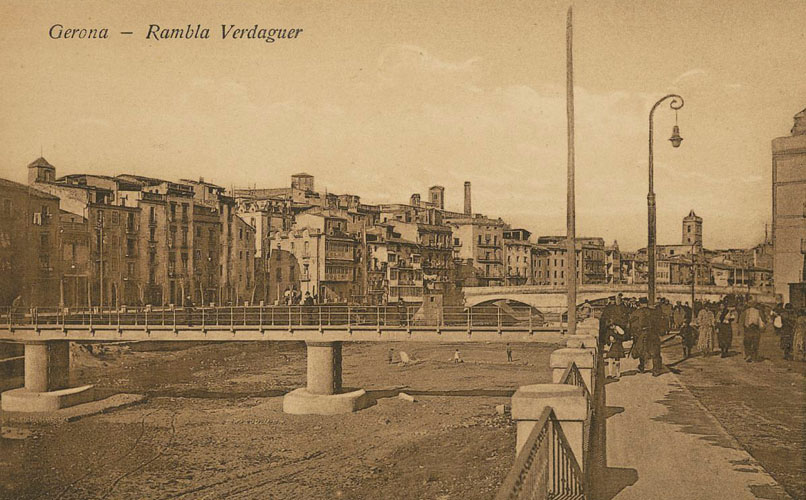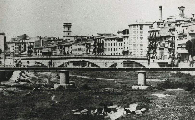 Notes (2) - L'any 1920 es va endegar un projecte de reparació del pont, signat per l'arquitecte municipal Martí Sureda i Vila (Girona, 1866-1947). El 1922 el també arquitecte municipal Ricard Giralt i Casadesús (Barcelona, 1884-1970) va fer un projecte de protecció dels peus d'aquests pont, amb un pressupost de 3.784 pessetes. Quan el pont va ser destruït per les inundacions de 1962, es va començar a parlar de fer la plataforma que actualment és la plaça Catalunya. (Article d'A. Girón, publicat al diari "Los Sitios de Gerona", 14 de desembre 1982). [Tornar al text] (3) - Molt lligat amb aquest pont va anar la construcció d'un mercat municipal sobre el riu. El 1929 es va fer un projecte de mercat sobre l'Onyar a càrrec de l'arquitecte Joaquim Maggioni, que tot i haver-hi posat una part dels fonaments restà sense continuar. El 26 d'abril de 1929 l'Ajuntament d'aleshores decidí d'aprovar el projecte, i el 16 d'octubre ja es feia referència a la iminència de l'acabament dels fonaments. Amb tot, pel 1934 l'obra estava totalment paralitzada, atès que el nou Ajuntament es trobava pledejant per tal que hom declaré,s nul l'acord de 16 d'octubre de 1929 al·legant que era una clara transgressió de la llei. Finalment el projecte restà encallat i encara es podien veure els fonaments abans que es comencés a construir la plaça de catalunya damunt l'Onyar. ("Girona: rius, ponts, aiguats". Ramon Alberch, Pere Freixas, Emili Massanas, Joan Miró, 1982). [Tornar al text]