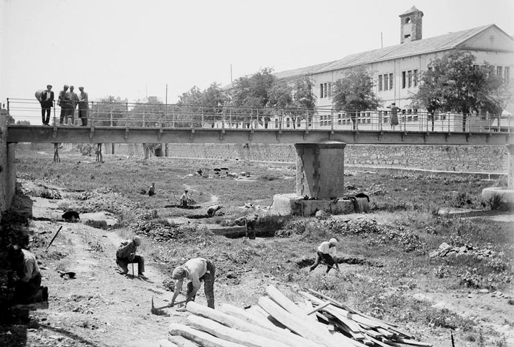 La vaga del sector del carbó a Anglaterra, que va repercutir en les fàbriques metal·lúrgiques espanyoles i en les comandes d'acer per el pont, va fer que les obres es duguéssin a terme amb més problemes dels que s'havia previst inicialment. El 5 de juliol de 1912 es van fer les proves de resistència (400 kg per m2), que van ser satisfactòries, de manera que l'abril de l'any següent ja es va inaugurar (2). ![]() (Ampliar) - Acabament de les obres del Pont del Pes de la Palla sobre el riu Onyar. El pont comunicava la rambla Verdaguer amb la rambla Pi i Maragall. 1913. Autor desconegut. CRDI - Ajuntament de Girona.![]() (Ampliar) - Vista des d'un punt elevat d'una crescuda del riu Onyar. Al centre, el pont del Pes de la Palla i el pont del Carme. A l'esquerra, el carrer del Carme i a la dreta, el convent del Mínims. 1913-1920. Josep Jou Parés. CRDI - Ajuntament de Girona![]() (Ampliar) - El riu Onyar amb el pont del Pes de la Palla i el pont de Pedra. En primer terme es veuen unes dones rentant al riu. Al fons, el campanar de l'església del Mercadal, la torre de les Aigües i la xemeneia de la Gròber. 1926-1935. Autor desconegut, fototípia Thomas. CRDI - Ajuntament de Girona.![]() (Ampliar) - Vista del riu Onyar des del passeig del General Mendoza. Sobre el riu, el pont del Pes de la Palla i darrera seu, el pont de Pedra. Al fons, el campanar de les Bernardes. A la dreta, la rambla de Jacint Verdaguer. Al fons sobresurten, d'esquerra a dreta, el campanar de l'església de les Bernardes, i les torres del Sagrat Cor. 1913-1926. Autor desconegut. CRDI - Ajuntament de Girona.![]() (Ampliar) - Mercat del bestiar a l'Areny del riu Onyar. Al fons, el carrer del Carme i el pont del Pes de la Palla. 1913-1920. Autor desconegut. CRDI - Ajuntament de Girona.![]() (Ampliar) - Retrat de la família Casellas Xirgu a les escales del pont del Pes de la Palla. S'identifica a Jaume Casellas, Joaquima Xirgu i Joan i Josep Casellas. 1935. Autor desconegut. CRDI - Ajuntament de Girona.![]() (Ampliar) - Antiguos arcos de la rambla Pi i Margall. Posteriorment despareguts en part. Al fons, el pont del Pes de la Palla i l'església del Sagrat Cor. 1913-1936. Valentí Fargnoli Iannetta. CRDI - Ajuntament de Girona.![]() (Ampliar) - Arrossegament del Pont de Can Ventura. situat entre la rambla Verdaguer i la rambla Pi i Margall. 12 d'octubre 1962. Josep Buil Mayral. CRDI - Ajuntament de Girona.![]() (Ampliar) - Automobilistes a la rambla Jacint Verdaguer. A l'esquerra, el pont del Pes de la Palla i el Pont de Pedra, al darrera. 1913-1920. Autor desconegut. CRDI - Ajuntament de Girona.![]() (Ampliar) - La rambla de Jacint Verdaguer a l'altura del pont del Pes de la Palla. En segon terme, el pont de Pedra i al fons, el campanar de l'església de les Bernardes. 1913-1920. Autor desconegut. CRDI - Ajuntament de Girona.![]() (Ampliar) - La rambla de Jacint Verdaguer i el riu Onyar. A l'esquerra el pont del Pes de la Palla, i el pont de Pedra. Al fons, el campanar de les Bernardes. 1915-1918. Autor desconegut. CRDI - Ajuntament de Girona.![]() (Ampliar) - El riu Onyar al seu pas pel centre de la ciutat. A l'esquerra, la rambla Pi i Margall i a la dreta, la rambla Jacint Verdaguer i l'inici de la rambla de la Llibertat amb la Sales d'Exposició Municipals. Sobre el riu, el pont del Pes de la Palla i el pont de Pedra. Al fons sobresurten la Torre de les Aigües, una xemeneia de la fàbrica Gróber i el campanar de l'església de les Bernardes. 1928-1930. Autor desconegut. CRDI - Ajuntament de Girona.![]() (Ampliar) - Vista del riu Onyar durant l'aiguat de l'any quaranta on apareix el pont del Pes de la Palla superat per l'aigua. A la dreta s'observa la rambla Verdaguer i algunes persones amb paraigües contemplant el riu. 1940. Autor desconegut. CRDI - Ajuntament de Girona.![]() (Ampliar) - Obres al llit del riu Onyar per a la construcció del Mercat Municipal projectat per Maggioni. Algunes persones s'ho miren des del pont del Pes de la Palla. A la part superior s'observa el convent de Sant Francesc de Paula, conegut popularment com els Mínims, en funcions de caserna i magatzem militar. 1929. Josep Jou Parés. CRDI - Ajuntament de Girona.![]() (Ampliar) - Pont del Pes de la Palla, en primer terme. Autor desconegut. CRDI - Ajuntament de Girona. |