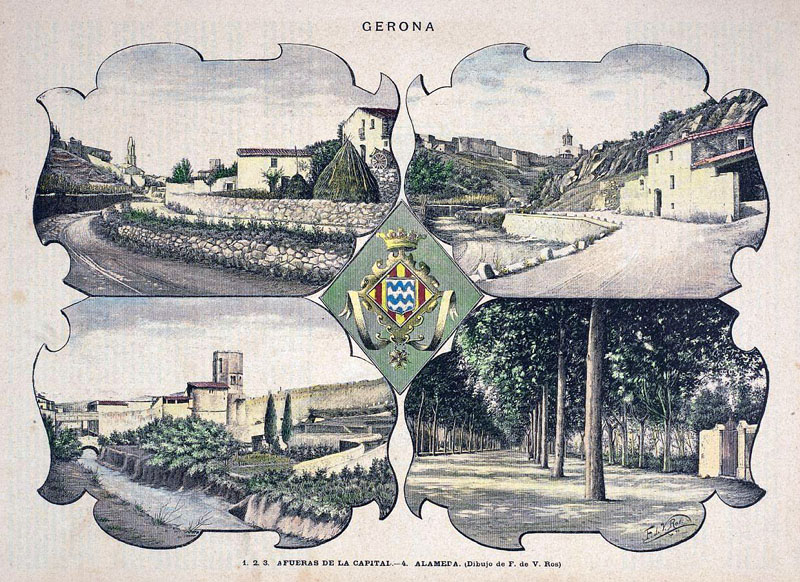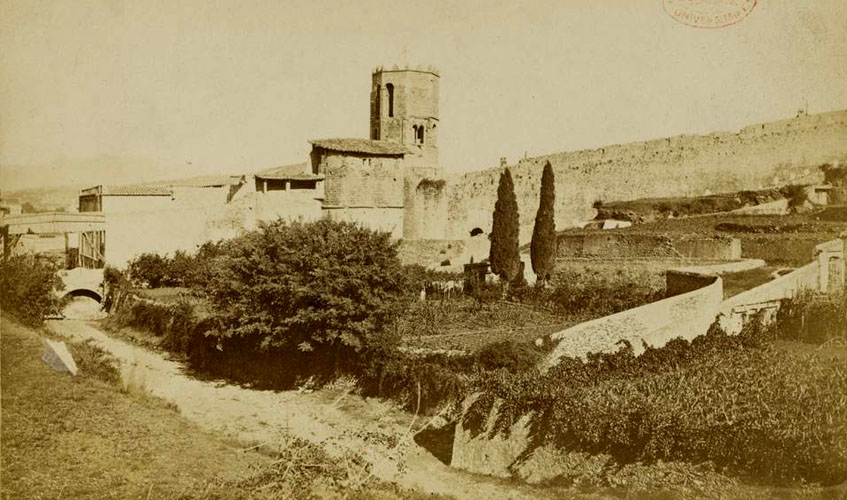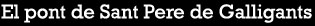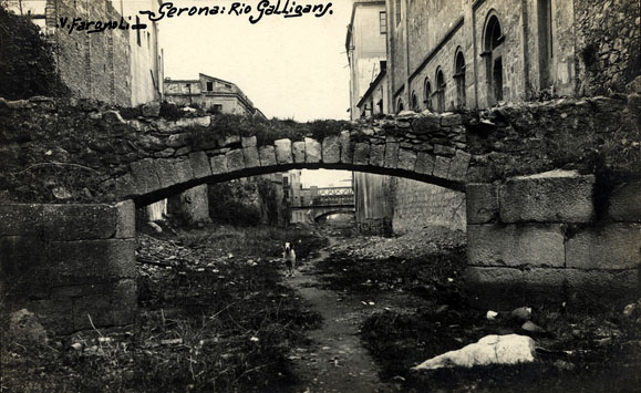 Pont de dubtós origen i utilitat, possiblement es tracta d'un pas sota la muralla de la ciutat per salvar el curs del Galligants. Els treballats elements que suporten pels dos extrems l'actual passera, mantinguda quan les obres del passeig Arqueològic, inaugurat el 1961, fan suposar que es tractava d'una construcció important. ![]() (Veure-la sencera) - Detall d'una postal on s'observa el sector de muralla a tocar Sant Pere de Galligants amb el pas pel riu. 1890. Dibuix F. V. de Ros. CRDI - Ajuntament de Girona. L'absència de referències textuals i d'imatges que en deixin constància gràfica detallada ajuden a refermar la hipòtesi que es tractaria d'una part dels elements defensius del llenç de muralla que baixava des de la Torre Cornelia a la vall dels Galligants, i s'enfilava cap a la torre de Santa Llúcia. ![]() (Ampliar) - El burg de Sant Pere el 1535. El número 11 indica el monestir de Sant Pere de Galligants, i el 13, el Galligants, la muralla del rei en Pere i la posició del pont. Detall d'un dibuix de Jordi Sagrera publicat a "La ciutat de Girona l'any 1535". ![]() (Veure-la sencera) - Sant Pere de Galligants. S'hi observa el pas del riu. Ca. 1890. Université de Bordeaux Montaigne. ![]() (Veure-la sencera) - El pont sobre el Galligants. 1902-1940. Valentí Fargnoli i Annetta. INSPAI - Diputació de Girona.