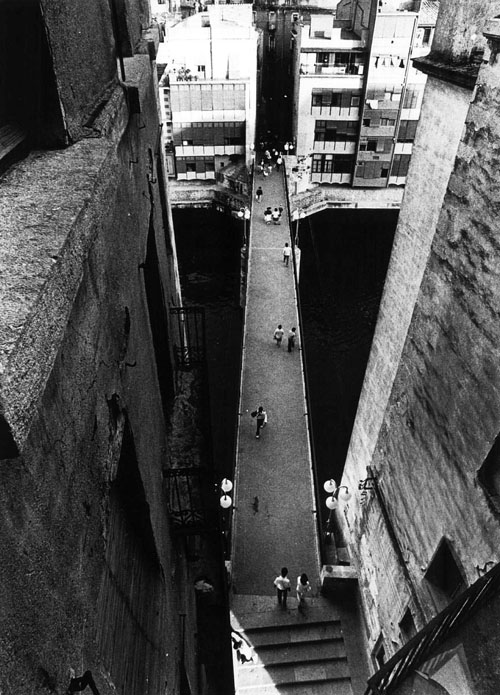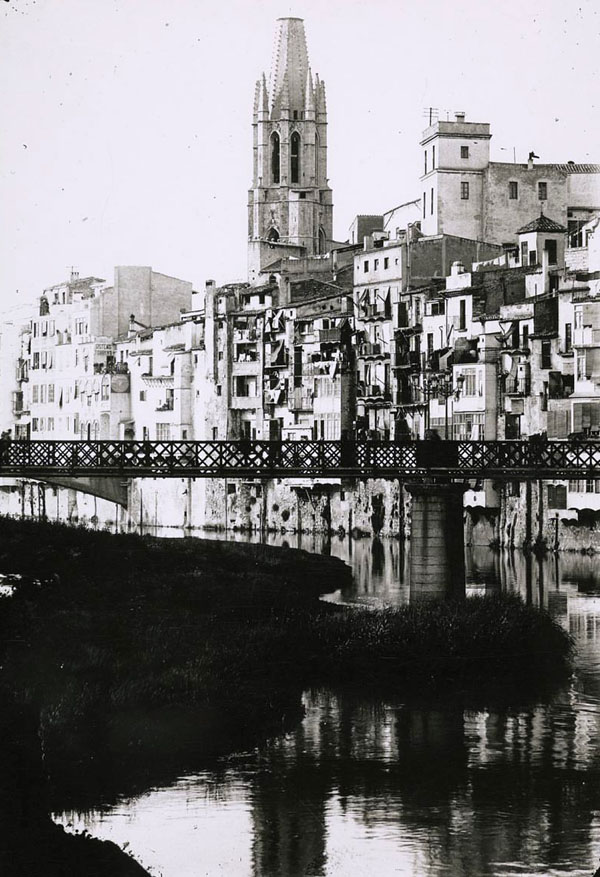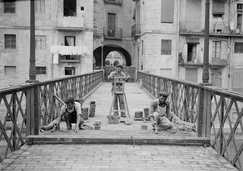El 1877, coincidint gairebé amb la instal·lació del pont de les Peixateries Velles, dit també Palanques Vermelles, s'hi va construir un pont de ferro projectat per Manel Almeda, pel preu de 14.500 pessetes. El 1922 la constructora Torras hi va dur a terme un canvi de la pavimentació enrajolada del pont (2). ![]() (Ampliar) - Vista del riu Onyar i les cases del riu després d'una nevada. En primer terme el pont de Sant Agustí, que va ser substituït per un de nou el 1973. Al fons el pont de les Peixateries Velles. 1960-1970. Josep Buil Mayral. CRDI - Ajuntament de Girona3. La passera de formigó. El 1973 el pont metàl·lic de Sant Agustí va ser substituït per l'actual passera de formigó armat. Un informe dels Serveis Tècnics de l'Ajuntament emès el 31 de març de 1973 descrivia així l'estat del pont: "Como consecuencia de unos estudios previos a reparaciones proyectadas en el puente de San Agustín, se ha llegado a la conclusión de que se halla en su último período de tiempo". Tres mesos després d'aquell informe, mentre es duien a terme les obres d'estudi de l'estructura, va cedir la part esquerra del pont, que va caure al riu. Això va precipitar l'elaboració del projecte d'un nou pont, fet de formigó armat, que es va estrenar a principis d'octubre del mateix any. ![]() (Ampliar) - Obres per a la substitució del paviment del pont de Sant Agustí. S'observen tres obrers realitzant les tasques de pavimentació enrajolada del pont, de la constructora Torras. 1922. Josep Jou Parés. CRDI - Ajuntament de Girona.![]() (Ampliar) - Construcció de les rampes lateral del pont de Sant Agustí. Març 1989. Núria Santiago Egea. CRDI - Ajuntament de Girona.Notes (1) - L'any 1804 el pont tenia una llargada de vint-i-set canes i un pam, i constava de dos arcs. ("Girona: rius, ponts, aiguats". Ramon Alberch i altres). [Tornar al text] (2) - Després del pont de Pedra era el més important per a la comunicació del centre de la ciutat amb el barri del Mercadal i molt sovint havien de fer-s'hi reparacions. La companyia "Construcciones y Pavimentos" va fer proves de resistència i diverses obres l'any 1917. El 1920 la Comissió de Foment del Consistori va proposar de reparar-lo, i finalment, diferents treballs d'agençament el 1922. ("Girona: rius, ponts, aiguats". Ramon Alberch i altres). [Tornar al text] |