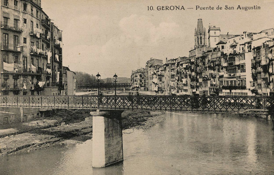 Aquest pont, que uneix el carrer de l'Argenteria amb la plaça de la Independència, deu el seu nom a l'antic convent de Sant Agustí que hi va haver en aquesta plaça, actualment anomenada de la Independència, des de 1608 fins a principis del segle XIX, en que durant la ocupació francesa, va ser abandonat i el 1815 probablement destruït. ![]() (Ampliar) - El pont de Sant Agustí sobre el riu Onyar. 1919-1930. Autor desconegut. CRDI - Ajuntament de Girona.1. Un pont de fusta. L'orígen d'aquest pont es remunta al 1647, quan l'Ajuntament, atenent una petició dels frares del convent de Sant Agustí, va construir una palanca de fusta sobre l'Onyar per tal que el convent disposés d'una via de comunicació amb l'Argenteria i els centres comercial i religiós de la ciutat. Després de l'aiguat del 13 de desembre de 1663 s'hi va construir un pont d'obra, al menys pel que fa als estreps i a un pilar central (1), que no va tenir una durada gaire llarga. Els anys 1830 i 1852 el pont tornava a ser de fusta. ![]() (Ampliar) - Gent creuant el pont de Sant Agustí, sobre el riu Onyar. Al fons, a la dreta, el pont d'en Gómez i el pont del Ferrocarril. 1915-1920. Autor desconegut. CRDI - Ajuntament de Girona.2. El pont metàl·lic.