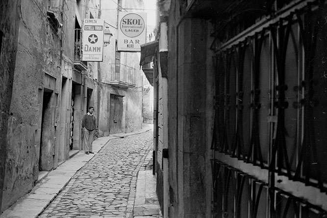 vista del carrer del Portal de la Barca. A l'esquerra, l'entrada d'un bar no identificat. 1989. Lluís Cruset Ballart. CRDI - Ajuntament de Girona - (Ampliar)