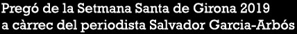 El dijous 11 d'abril es varen iniciar els actes de la Setmana Santa gironina 2019 amb el pregó, que en aquesta ocasió va anar a càrrec del periodista Salvador Garcia-Arbós, qui el va llegir a l'Aula Magna de la Casa de Cultura de Girona.