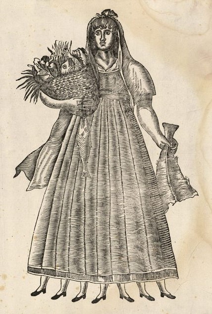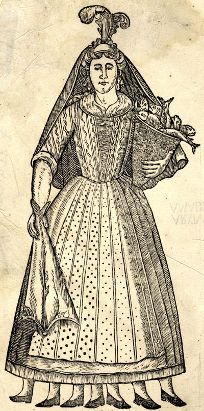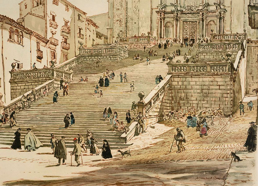 (Ampliar) - Escales de la Catedral. 1936. Dibuix de Muirhead Bone. CRDI - Ajuntament de Girona. Iconografia de la Quaresma. La Quaresma estava simbolitzada per una dona eixuta de carns, amb set peus calçats, que sostenia amb la mà esquerra una penca de bacallà i portava a la dreta un cistell amb verdures. Aquesta figura, retallada sobre cartró o fusta pintada, solia penjar-se a les botigues de queviures i, sobretot, a les bacallaneries, on la tenien voltada d'arengades i de penques i garlandes de tripes de bacallà. També les cases particulars tenien la típica estampa, o la seva silueta retallada en paper, clavada darrera la porta d'entrada o penjada damunt els fogons de la cuina, i la mainada, cada diumenge en tornar de missa, li anaven tallant els peus a raó d'un per setmana. Aquesta "vella" era el calendari quaresmal.