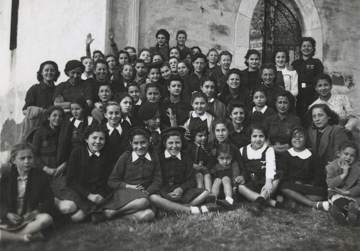 (Ampliar) - Retrat de grup davant la Capella de la Mare de Déu dels Dolors, al Calvari. 20 de març 1940. Ferran Forns Navarro. CRDI - Ajuntament de Girona. Els "Via Crucis".