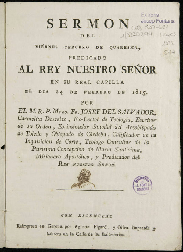 (Ampliar) - "Sermon del viérnes tercero de quaresma...". Segle XIX. Reimprès a Girona. Biblioteca de Catalunya.