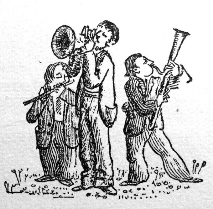 (Ampliar) - Tercet musical de flauta, fagot i fiscorn que acompanyava el Via Crucis. Gravat antic.