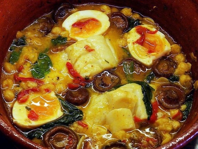 (Ampliar) - Bacallà amb cigrons, espinacs, carxofes i ous durs. Fotografia d'Abraham Simon. La cuina del bacallà.
