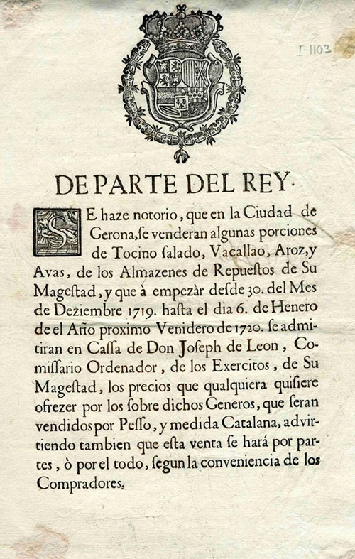 (Ampliar) - Ban reial que autoritza la venda de determinats aliments, entre altres bacallà. 1719. Arxiu Històric de Girona.