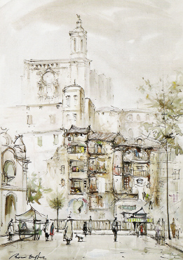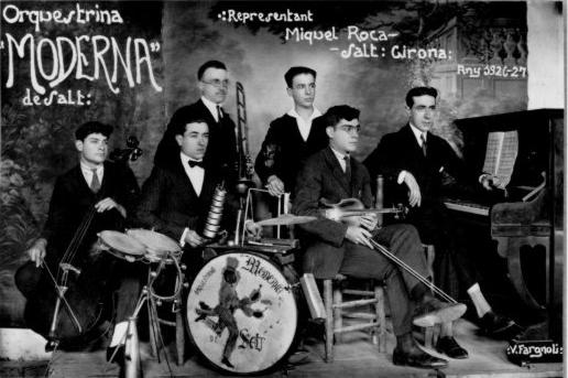 BiografiaNeix a Salt (Girona) el 26 d'agost de 1910, fill de Miquel Roca i Julià i d'Emília Delpech i Famada. La seva família era propietària d'una esparteria a Salt. El seu pare, Miquel Roca, excel·lent músic saltenc, l'inicià de ben petit en la pràctica del solfeig, alhora que Josep Saló li ensenyava a tocar el violí. Sembla, però, que la seva sòlida formació musical li vindria donada pels seus estudis musicals de la mà dels mestres Oliva i Francesc Civil. Aquests estudis els compaginava tocant el violí i la bateria a l'orquestrina del seu pare Oriental Jazz i Moderna de Salt. La seva primera sardana la composà l'any 1925 i es titulava La vella rondinaire; tot just havia fet els setze anys. Seguiren cronològicament i escalonadament les obres següents: Enllaç, Aparició, Garbinada, Alba, La Torrassa, La dansa del pastor, Espigues, Gavina, Ultònia, Pinzellada, Els ocells, Sílvia, Olga, i Salt. L'any 1926 féu el seu primer concert de piano al Saló de Música Sobrequés de GIrona amb les obres de Bach, Scarlatti, Chopin, Beethoven i Albèniz. Continuà fent concerts a diferents Associacions de Música de les comarques gironines: Sant Feliu de Guíxols, Olot, Figueres i Palamós. Ateses la seva gran qualitat musical, la insistència del seu pare, que va escriure diverses cartes a la Diputació, i un certificat de l'Ajuntament de Salt on s'acreditava que l'economia familiar era modesta, la Diputació de Girona li concedí una beca per poder anar a estudiar a l'estranger. Entre els anys 1927 i 1933 J. Roca Delpech va fer els estudis superiors de música a la Schola Cantorum de París amb els professors Vicent d'Indy i Paul Brand. Obtingué el Diploma Superior de Fi d'Estudis a la Schola Cantorum amb la màxima puntuació. Durant aquests anys va fer diversos concerts: dos a París a la Salle Erard, el 1929 i 1930, i un altre al Teatre Municipal de Girona el 1931. També, per complementar els seus ingressos mentre era a París, tocava el violí a Créteil, en un cinema on es projectaven pel·lícules mudes. Tornà a Girona l'estiu de 1932 i s'oferí a la Diputació per fer un concert en benefici de la Cantina Escolar, que va tenir lloc el 19 de juliol de 1932 al Teatre Municipal de Girona amb un repertori variat que incloïa obres de Schumann, Schubert, Listz, Albèniz, etc. Les diverses estades de Jaume Roca Delpech a París li permeteren visitar diferents museus, sales de pintura i estar en contacte amb els ambients carismàtics de la capital francesa, que durant molt temps fou el centre mundial de les avantguardes artístiques. Quan tornava per vacances freqüentava l'escola de dibuix del pintor saltenc Josep Aguilera del qual rebé ben segur profitoses lliçons de dibuix. Alhora, Jaume Roca Delpech informava el mestre Aguilera de les principals novetats artístiques que succeïen a París i arreu d'Europa. L'any 1934 s'establirà a Barcelona i obrirà una acadèmia de piano que tancarà en esclatar la guerra. Fins el 1936 va anar compaginant les tasques pedagògiques amb les actuacionsen sales de concerts. Va fundar una cobla anomenada Iris de Salt. ![]() Orquestrina Moderna de Salt. Al piano, el senyor Dídac Bover, al violí Lluís Moreno i Pallí i al violoncel Josep Moreno i Pallí. A dalt, amb ulleres, el senyor Miquel Roca i al seu costat el seu fill Jaume Roca Delpech. A la bateria, Arolas.Però l'esclat de la Guerra Civil va trencar aquesta dinàmica i amb pocs anys decantarà la seva expressió artística cap a un altre camp ben diferent: la plàstica. Les seves actuacions musicals s'aniran espaiant; la darrera fou l'any 1934 al Palau de la Música Catalana. Més tard, l'any 1948, se li ret homenatge amb un acte popular a la Rambla de Catalunya de Barcelona amb l'audició de totes les sardanes que ell havia composat. L'any 1940, instal·lat novament a Girona, inaugura la seva primera exposició d'aquarel·les i olis, amb una clara dominància de paisatges urbans de Girona i els seus voltants. A partir d'aquest moment inicia una llarga llista d'exposicions que a més de Girona inclouran altres ciutats com Figueres, Barcelona, Madrid, Càdis, París, Buenos Aires, València, etc. L'any 1949 l'Ajuntament de Salt li organitza una exposició homenatge a la Casa de la Vila. La seva repercussió internacional com a artista sembla que l'aconseguí a través dels contractes amb editorials alemanyes, daneses i sueques. Viatjava per les principals ciutats europees i d'Amèrica tot pintant aquarel·les de les ciutats i llocs més coneguts que després aquestes editorials imprimien i difonien. La seva pintura, segons diuen els experts, evolucionà a salts. En una primera època pintava amb aquarel·la i pintura a l'oli paisatges urbans, marines, interiors, natures mortes, etc., on sembla seguir la tendència realista del seu mestre Aguilera. Posteriorment, en els seus paisatges de l'entorn immediat de la ciutat retorna a la inspiració impressionista. També en una època determinada va tenir interès pel surrealisme i va realitzar diverses obres que posteriorment ell mateix va destruir. La seva obra dels anys cinquanta es caracteritzarà per la introducció de personatges en els seus paisatges. S'interessa pels mercats de bestiar, i assoleix una transformació cap a l'expressionisme que a voltes tendirà cap a l'abstracció. En viatjar al nord d'Europa cap als anys seixanta, la seva obra s'impregna del romanticisme nòrdic. Finalment, en la darrera època de la seva vida retorna a l'aquarel·la i a la pintura a l'oli. El tema imperant de la seva obra pictòrica és el paisatge i especialment els paisatges urbans. Artista clau a la Girona de la postguerra va ser un home avançat al seu temps. Cal recordar, per exemple, que els seus dibuixos undergrounds, plens d'humor i de sarcasme no van veure la llum pública fins l'any 1982, quan l'Ajuntament de Girona li retia homenatge amb una exposició al Museu d'Història de la Ciutat. Músic i pintor, Jaume Roca Delpech ha estat 