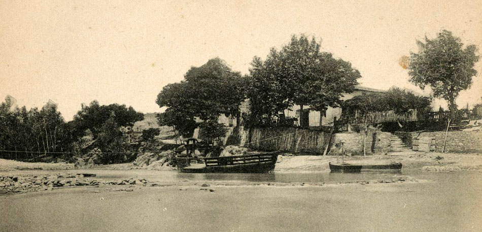 (Ampliar) - El riu Ter a l'altura de la barca, a Sant Ponç de la Barca, utilitzada per creuar el riu en aquest punt. Darrera seu, el merendero homònim. 1877. Joan Martí Centelles. CRDI - Ajuntament de Girona.