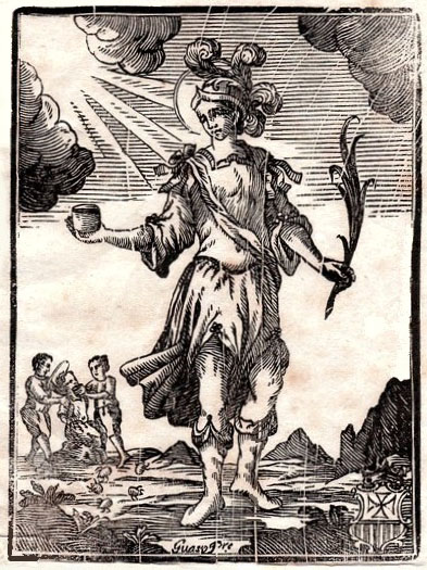 (Ampliar) - Gravat de Sant Ponç. A la imatge del fons, li fan beure el beuratge de xinxes. Extret del goig "El glorios mà:rtir San Pons" [sic]: "O San Pons qui les plegaries / oiu de los suplicants / matau xinxas, cuques feras, / que devoren nostras carns".
