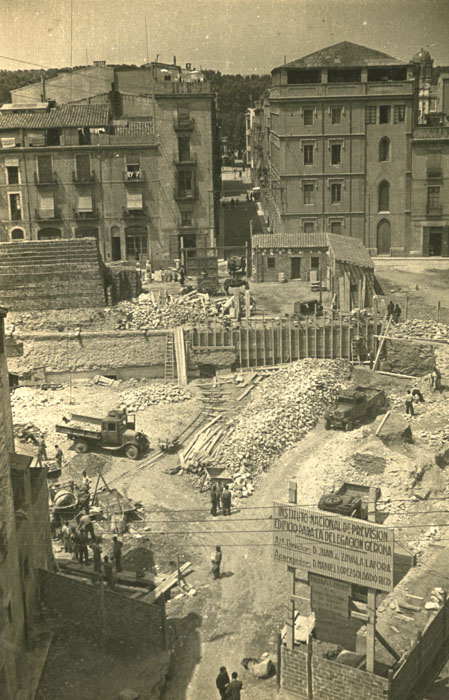 (Ampliar) - Obres de construcció de l'Institut Nacional de Previsió, posteriorment Centre d'Atenció Primària de Santa Clara. Al fons, l'encreuament del carrer Hortes i el carrer del Nord amb la residència de les Dominiques. 1947. Salvador Crescenti Miró. CRDI - Ajuntament de Girona.