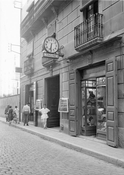 (Ampliar) - Rellotge de carrer a l'exterior de la rellotgeria J.Casellas, al carrer Santa Clara. 1963. Miquel Morillo Gallego. CRDI - Ajuntament de Girona.