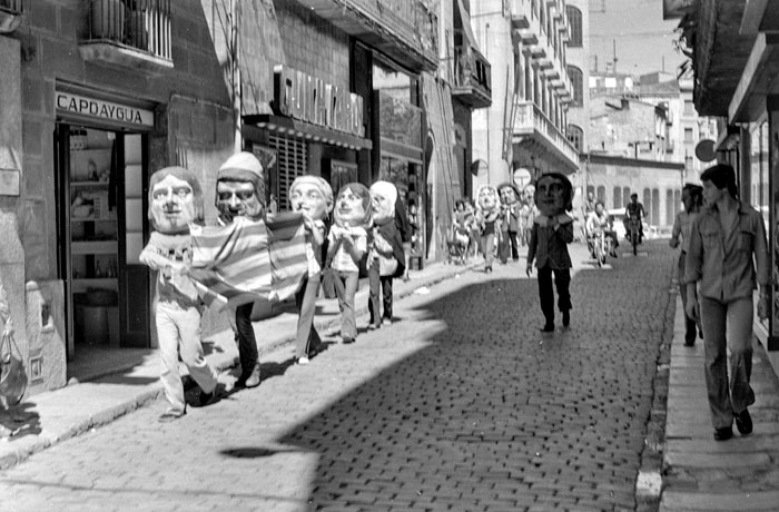 Cercavila de capgrossos al carrer Santa Clara. 11 de setembre de 1982. Joaquim Curbet Hereu. CRDI - Ajuntament de Girona - (Ampliar)