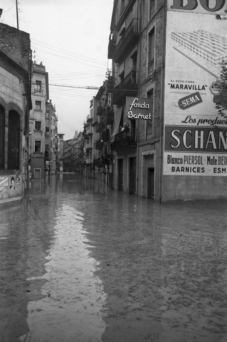 (Ampliar) - El carrer de Santa Clara inundat. A la dreta, la fonda Barnet. 1962. Narcís Sans Prats. CRDI - Ajuntament de Girona.