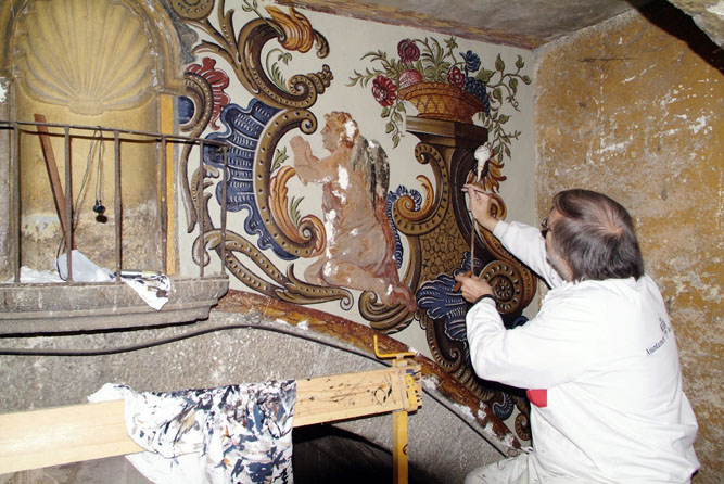 Ricard Renart treballant en les tasques de restauració dels frescos que acompanyen la Mare de Déu de la Bona Mort, al portal de Sobreportes. 2005