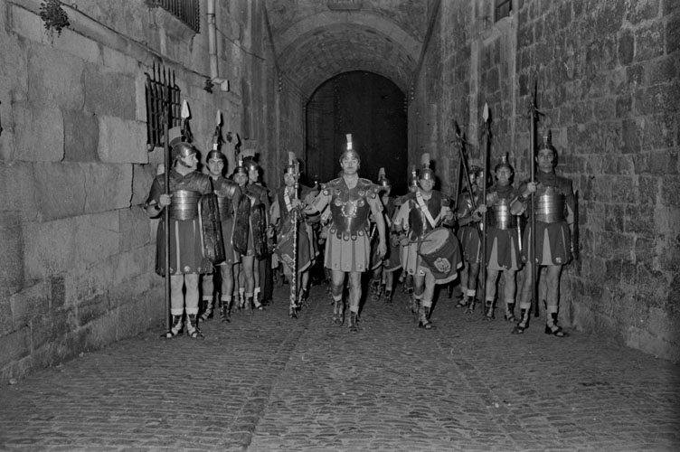 Els Manaies de Girona travessant el portal de Sobreportes per Setmana Santa. 1957