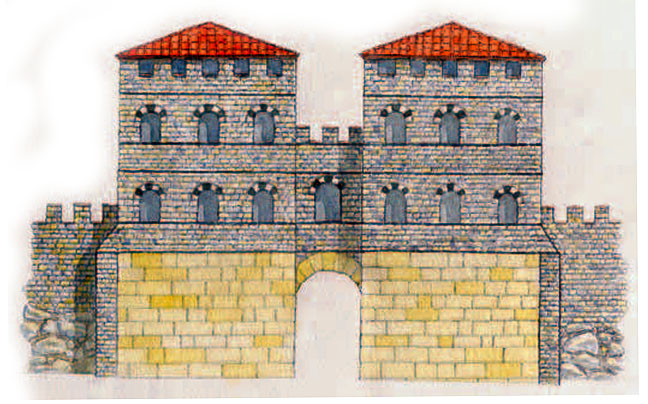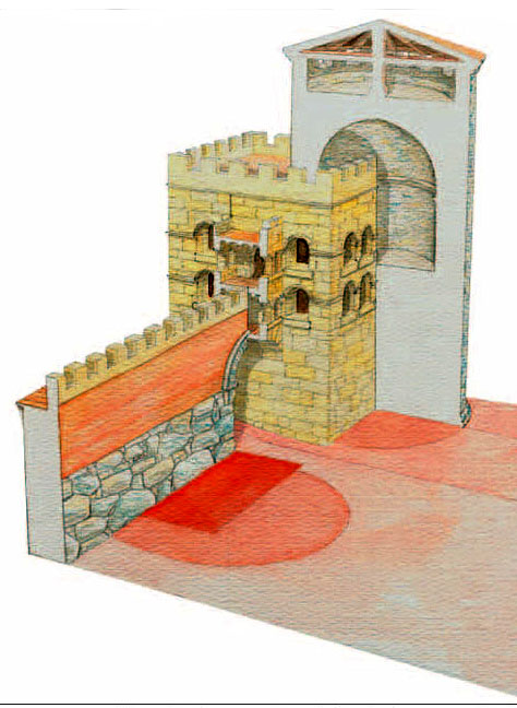 Reconstrucció hipotètica de la porta de nord de la ciutat (Sobreportes) a època carolíngia. La torre occidental està ben documentada fins al primer nivell de combat