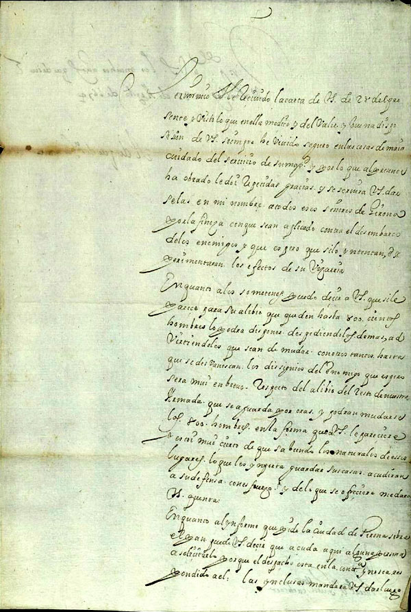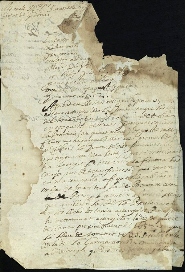 (Ampliar) - 1674/08/31. El lloctinent Francesco de Tuttavilla, duc de San Germano, al general Guillem Cascar. Li agraeix el servei prestat al rei i li encarrega que doni les gràcies als senyors de Girona que van col·laborar en evitar el desembarcament dels enemics. Amb relació al sometent li dóna permís per mantenir 800 homes fins que desaparegui l’amenaça. Font: AMGi, Lletres Reials