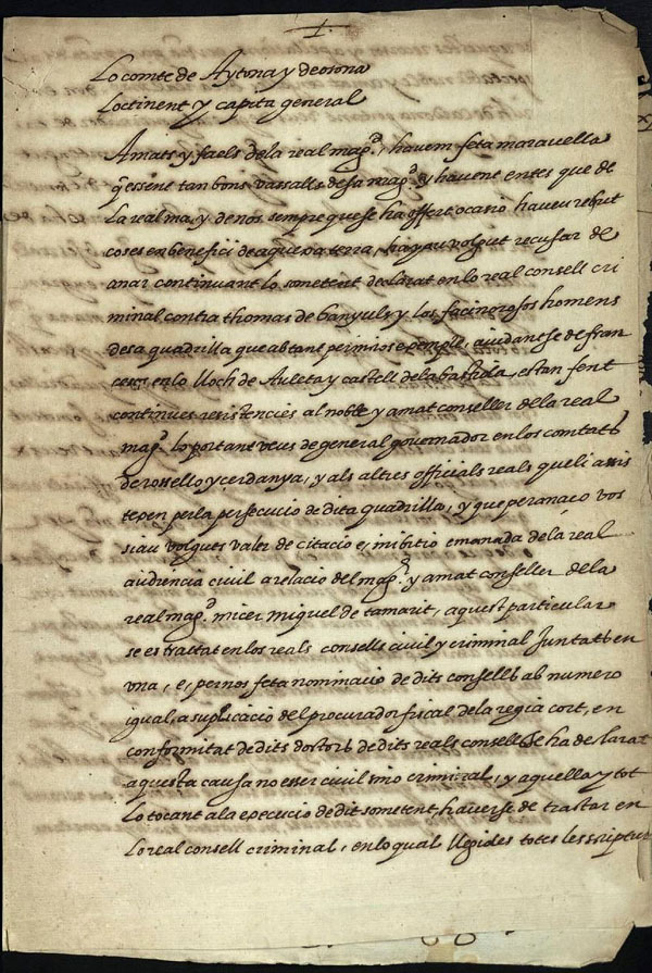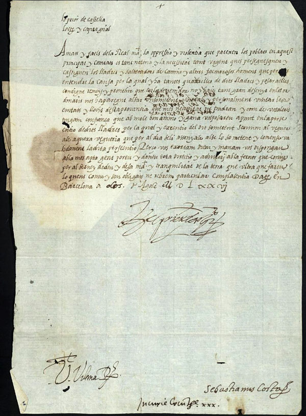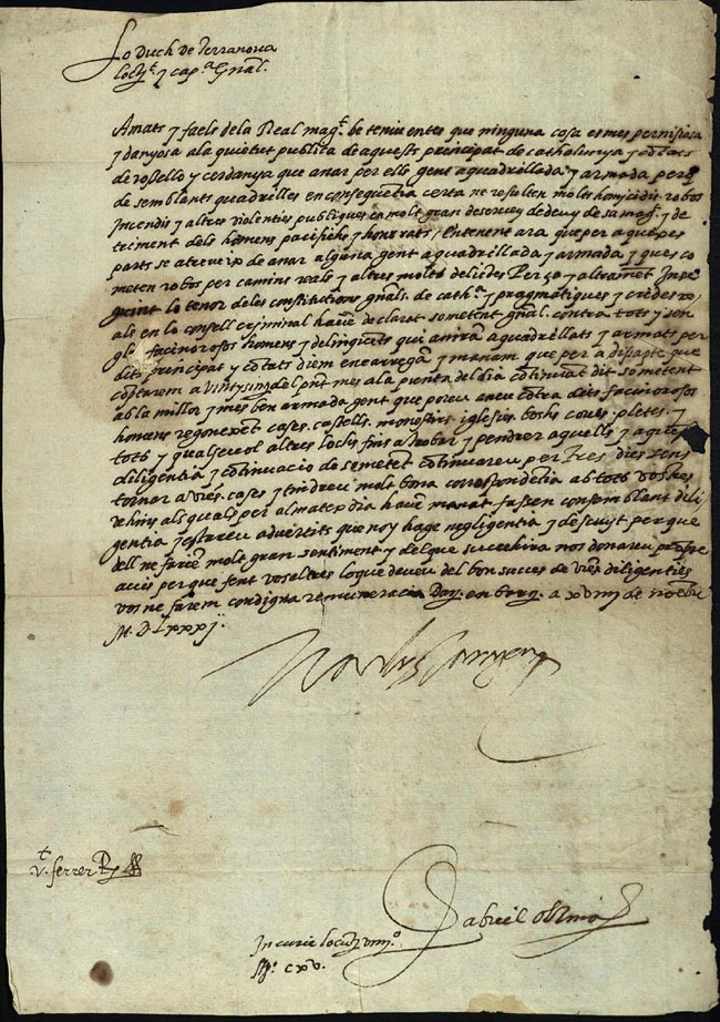 (Ampliar) - El lloctinent Carles d’Aragó, duc de Terranova, als jurats de la ciutat de Girona. Atesos els escamots que hi ha pels comtats del Rosselló i la Cerdanya, els comunica la convocatòria de sometent general i els mana que hi vagin el proper dia 25 i durant tres dies persegueixin els delinqüents fins a capturar-los. Font: AHCG, Lletres Reials.