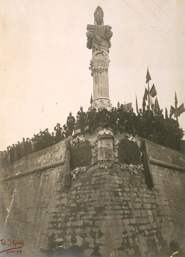 (Ampliar) - 1909/11/07. Acte commemoratiu del primer aniversari dels Setges i descobriment de dues làpides col·locades al peu del monument de l'exèrcit als herois de 1808-1809, conegut popularment com El Lleó, instal·lat a les restes de l'antic baluard de Sant Francesc. S'observa la presència d'artillers i del Sometent. Jesús Girbal Balandru. CRDI - Ajuntament de Girona