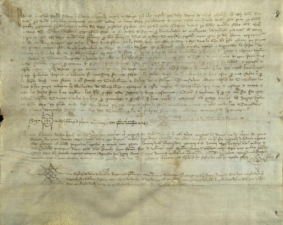 Trasllat de [...]. Guillem de Vilar, notari públic per tota la terra i dominació reial, amb la testificació de Joan de Soler i Francesc Fuster, notaris públics de Barcelona, i autentificat per Galceran Sestrada, batlle de Barcelona, per mà de Pere Claver, notari públic per tot Catalunya. Font: AMGi.