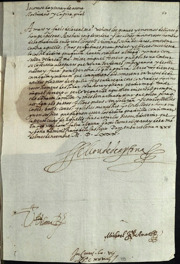 (Ampliar) - 1580/11/30. El lloctinent Francesc de Montcada, comte d’Aitona i d’Osona, als jurats de la ciutat de Girona. Atesos els greus delictes perpetrats per Antoni Roig de Tordera i altres delinqüents, els comunica que s’ha declarat sometent contra ells i els prega que tan aviat com Miquel Ferreró —a qui se li ha confiat el cas—, o el veguer els avisin, tinguin la millor gent armada preparada per a la persecució dels esmentats malfactors. Font: AMGi - Cartes reials.