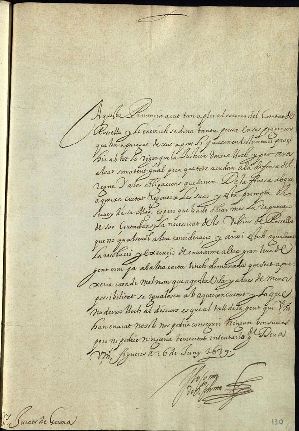 (Ampliar) - 1639/06/26. El lloctinent Dalmau de Queralt, comte de Santa Coloma, als jurats de la ciutat de Girona. Atesos els progressos de l’enemic al comtat de Rosselló, els comunica la convocatòria de sometent general per tal de defensar-lo convenientment.