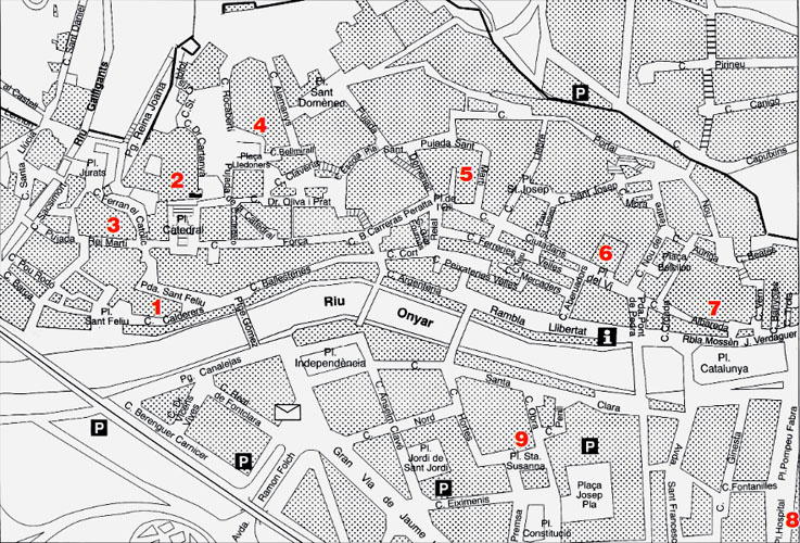 memòria, parcel·les de vigília, de reunió, de pietas, de festa, de reposat tempus fugit. ![]() (Ampliar) - Plànol de Girona amb la situació dels campanars. (1) Basílica de Sant Feliu. (2) Catedral. (3) Sant Lluc. (4) Església Filles de Sant Josep. (5) Església del Carme. (6) Ajuntament. (7) Església del Sagrat Cor. (8) Generalitat de Catalunya. (9) Església del Mercadal. |
