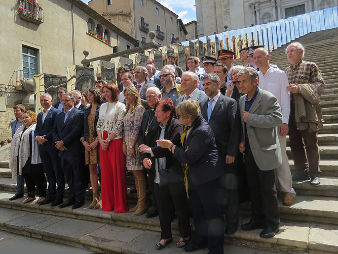 (Ampliar) - Foto de grup dels assistents a la inauguracióLa inauguració s'ha fet davant del muntatge més concorregut, any rere any, durant l'esdeveniment. Es tracta de la composició que ocupa les emblemàtiques escales de la Catedral i que s'anomena "Codi Petri". A través de miralls, altera la percepció clà:ssica de l'escalinata i convida el visitant al descobriment de múltiples perspectives que canvien en funció de la franja horària. A més, en aquest edició i per primera vegada, la composició permet que els visitants puguin pujar i baixar les escales, formant part del muntatge.