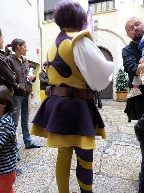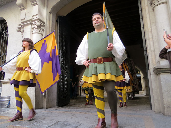(Ampliar) - Vestuari dels banderers. DetallsEls nous personatges van utillats amb sengles banderes amb símbols de la ciutat: una mosca (per les mosques de Sant Narcís, una fulla de la Devesa, el perfil de Sant Feliu i la Catedral reflexats a l'Onyar, i l'escut de la ciutat. Els motius es repeteixen a l'esquerra dels vestits dels portadors.