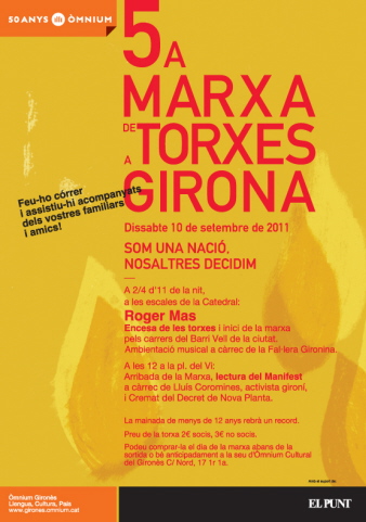 La V Marxa de Torxes a Girona ha tingut lloc el 10 de setembre, la vígila de la Diada Nacional de Catalunya, l'any 2011 sota el lema "Per un país de tots, l'escola en català". L'inici de l'acte ha estat a les escales de la Catedral, on ha actuat el cantautor de Solsona Roger Mas, i, seguidament, l'encesa de les torxes i l'inici de la marxa pels carrers del Barri Vell de la ciutat. El grup musical la Fal·lera Gironina ha estat l'encarregat d'amenitzar el recorregut amb el so de les gralles i els timbals