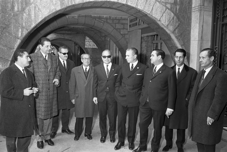 Presa de possessió de l'alcalde de Girona, Josep Bonet Cufí. L'alcalde sortint, Pere Ordis Llach, amb els regidors, entre ells Joaquim Pla Dalmau, a les Voltes d'en Rosés. 1967. Narcís Sans Prats. CRDI - Ajuntament de Girona - (Ampliar)