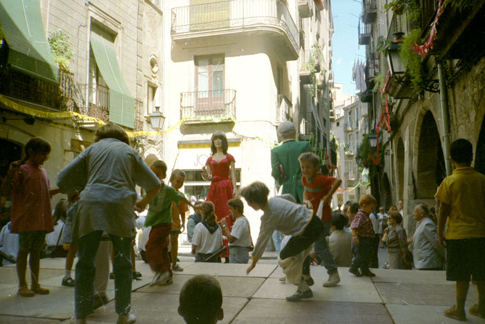 Els gegants Xavier Cugat i la Musa a les Voltes d'en Rosés. 1993. Juli Torres Monsó. CRDI - Ajuntament de Girona - (Ampliar)