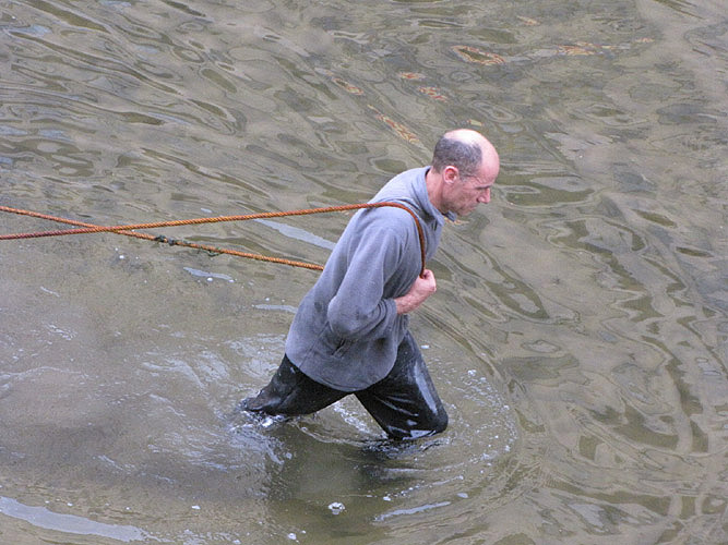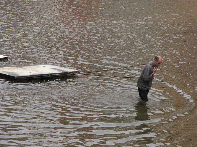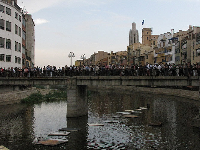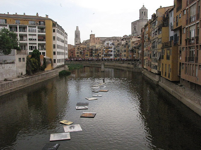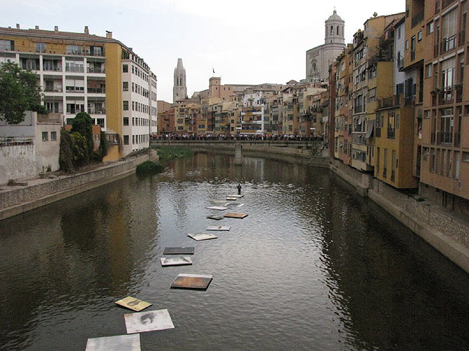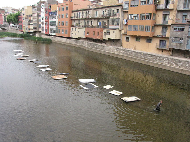 Acció plàstica "Travessia" del pintor Jordi Isern. Arrossegament de divuit quadres de grans dimensions pel riu Onyar. 12 de maig 2012. |