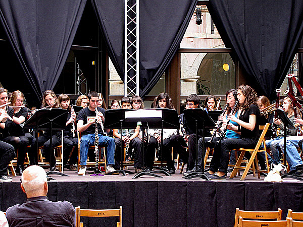 17 de maig 2009. Claustre del Carme. Diputació. Assaig de la Banda del Conservatori de Música de Girona. Escultures de Josep Mundet.