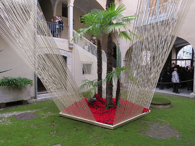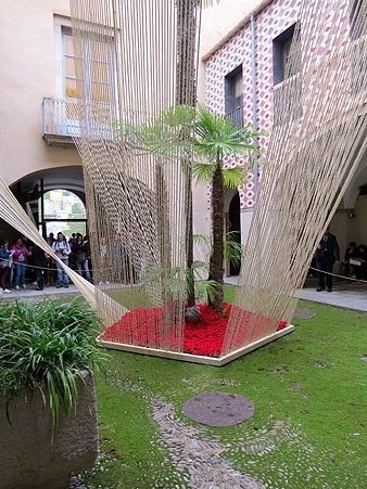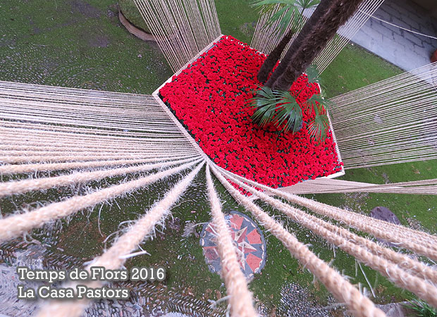 Instal·lació del projecte "Renéixer", del col·lectiu La Mosca. Un joc de textures, visuals i dualitats: temporal i intemporal, existent i naixent, masculinitat i feminitat... Un nou cor florit en el si de la casa que connectant les seves parts fa renéixer tot l'espai. D'aquest renéixer de la vida, unes cordes s'enlairen a la recerca de la llum. Com el teixit de les Moires, representen aquest tapís que és el món del qual formem part tots i cadascun de nosaltres.