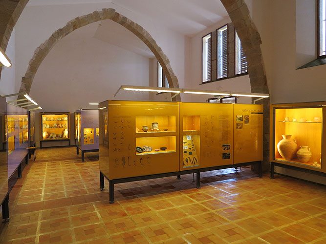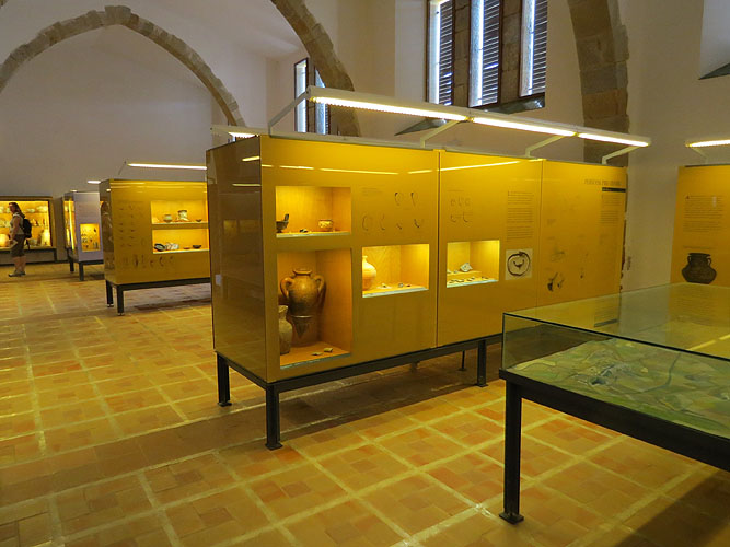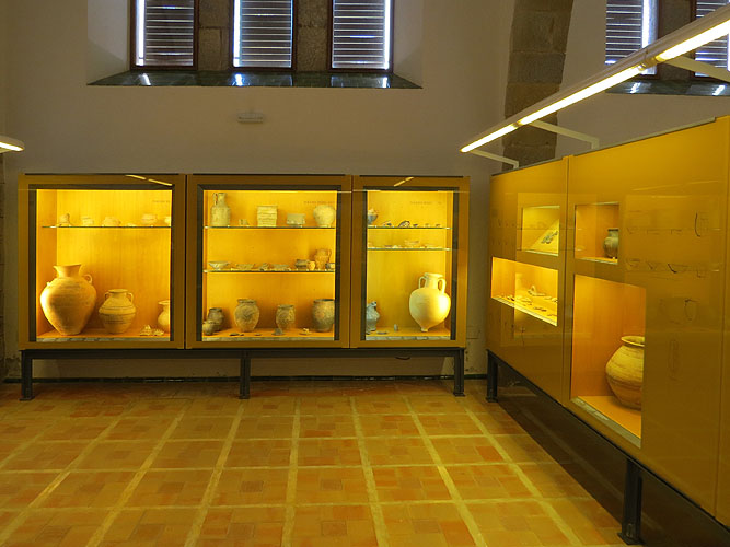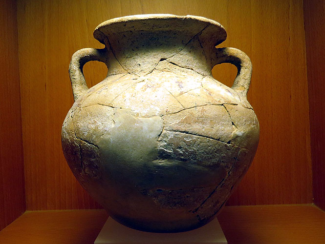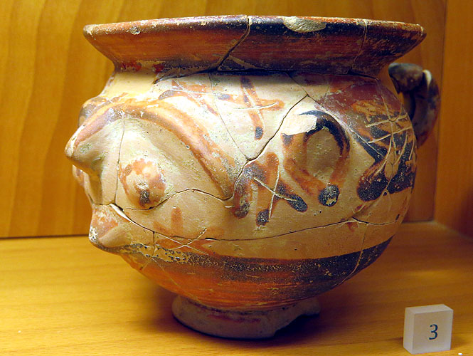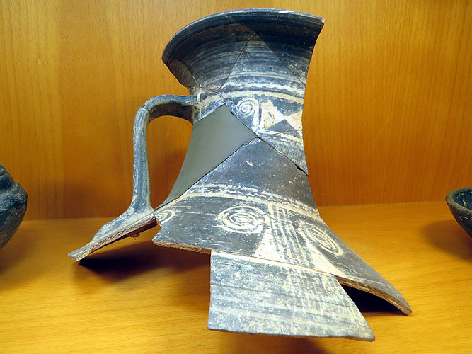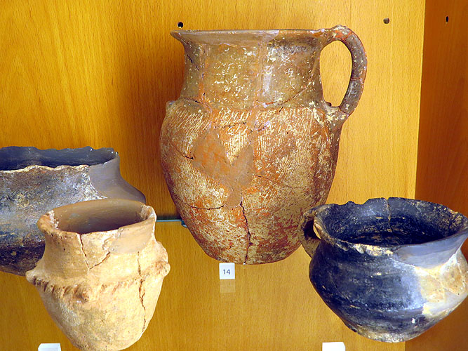 Ceràmica feta a mà. Esquerra: vaset de perfil en S , decorat amb cordó i mugrons, 600-450 aC. Centre: Gerra de perfil en S, amb una nansa, amb decoració d'incisions i mugrons, 500-450 aC. Dreta: vas carenat amb nansa, 600-500 aC |