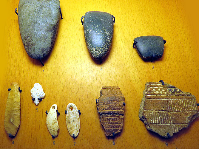 Destrals votives neolítiques. Fulles de sílex, punta de fletxa, penjolls i fragments de vas campaniforme del Calcolític |