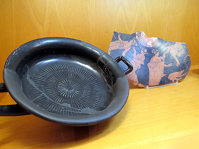 Esquerra: kylix àtic de peu baix de vernís negre, amb decoració impresa a l'interior. Clase "Delicada", darrer quart segle V aC. Dreta: fragment de tapadora amb figures roges, 420-410 aC |