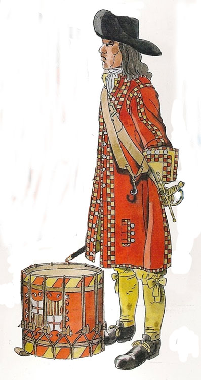 Tambor del Terç de la ciutat de Barcelona. La Guerra dels Nou Anys (1689-1694). Dibuix de Francesc Riart - (Ampliar)