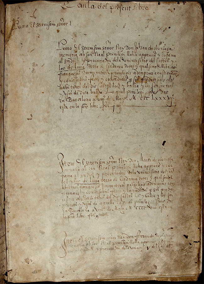 (2) El 'Llibre Ferrat' és el nom amb què es coneix el llibre de privilegis i ordinacions de la vila de Llívia. El nom de Ferrat li ve pels claus que ornen les cobertes de fusta. Va ser començat a la segona meitat del segle XVI i escrit a diverses mans fins a principis del segle XVII. Recull els privilegis municipals atorgats a Llívia pels reis de Catalunya i Aragó, des de Joan I fins a Carles V. - (Tornar al text)