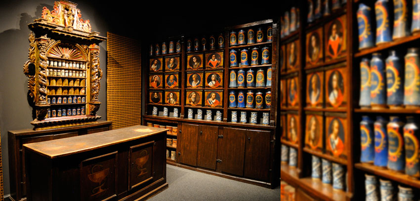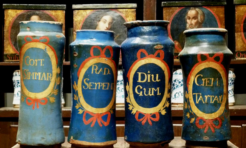 Farmàcia Esteve. Pots monocroms, vidriats en blau cobalt per fora i esmaltats en blanc a l’interior, probablement de Talavera, segle XVI