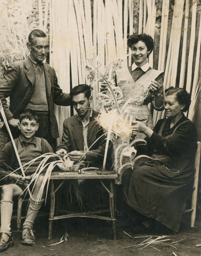 La família Olivas, cistellers de Banyoles, al pati de casa seva al carrer Major de Banyoles, fent palmes per al Diumenge de Rams. Podem veure de dalt a baix i d'esquerra a dreta: Francesc Olivas, Dolors Olivas, Xavier Olivas, Joan Olivas i Caterina Coll. 1945. Memòria Digital de Catalunya. - (Ampliar)