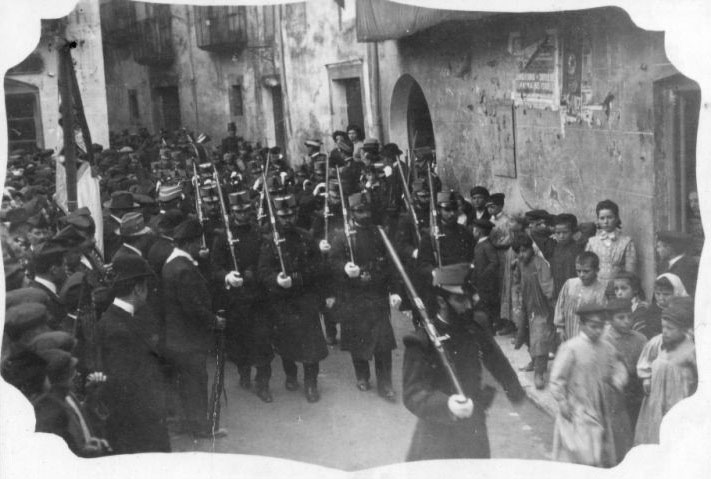 Homenatge fet el 26 de desembre de 1909 al doctor Francesc Rovira Sala, coronel i sacerdot de Sant Miquel de Campmajor, que protagonitzà una de les batalles més mítiques de la Guerra del Francès. La desfilada militar passa davant de la Pia Almoina, antiga Casa Consistorial de Banyoles. Arxiu Comarcal del Pla de l’Estany. Fons d’Imatges del Pla de l’Estany. - (Ampliar)