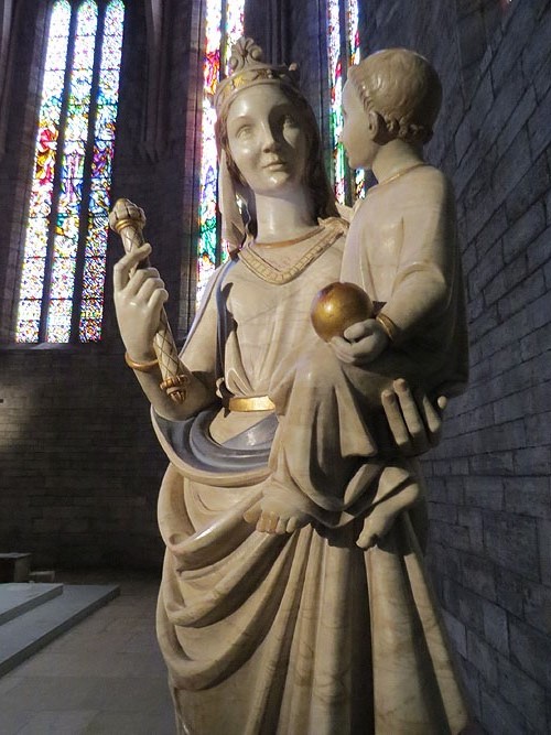Mare de Déu d'alabastre blanc, obra de l'escultor banyolí Josep M. Bohigas Masoliver (1957) inspirada en les marededeus gòtiques. Presbiteri de Santa Maria dels Turers. - (Ampliar)