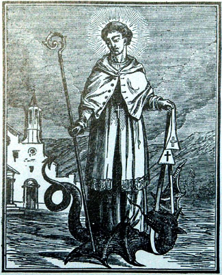 Sant Mer, o Emeri, un monjo benedictí, llegendari fundador i abat del monestir de Sant Esteve de Banyoles. Gravat d'un goig del començament del segle XIX. Viquipèdia. - (Ampliar)